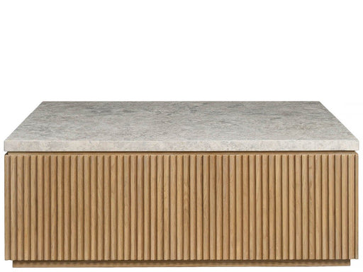 Universal FurnitureThe Carmen Cocktail Table, a striking blend of natural beauty and modern design, features a sleek stone top and a distinctive base with a textured,...
