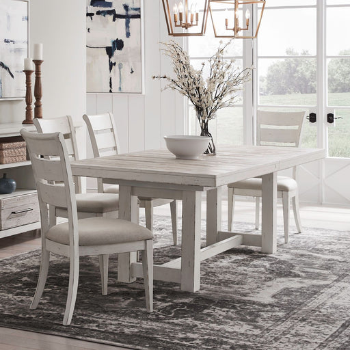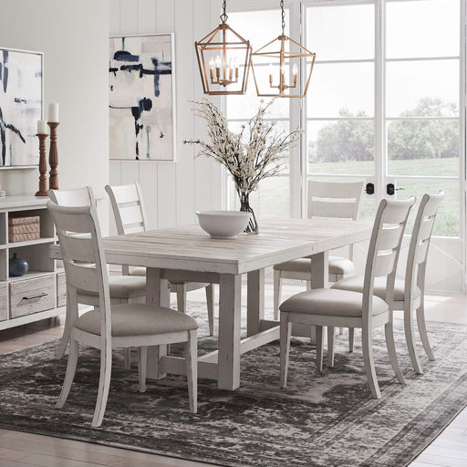 Liberty FurnitureIt’s never been easier to be elegant with the Abbey Park trestle table set. Crafted of poplar and rubberwood solids with cathedral white oak and bi...