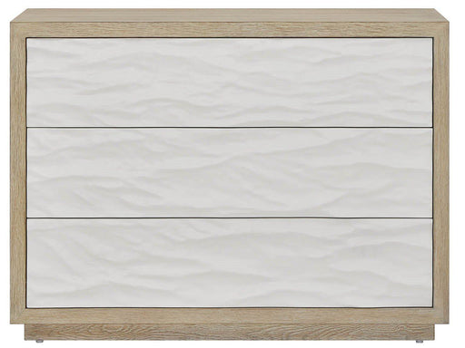 Universal FurnitureThe Oasis Dresser features elegant three-drawer storage with sculptural wave-patterned drawer fronts in white, beautifully contrasting with the war...