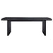 Inspired by trending interior design aesthetics increasingly mixing modern and traditional elements to invent its own style, this wood dining set stands out to impress. Crisp, clean style and a contrasting color and finish palette begin the dramatic look of a set suitable for both modern and transitional settings important to your everyday living. Distressed black finish wood construction on all pieces gains attention to a minimalist table design with straight, flat leg sections under a sleek top with linear silhouetting and a dimensional top chamfer curving along its edges. Chairs offer a clean silhouette with black finish wood framing, tapered legs, and ornate notched tops with linear carvings thrown in for extra dimension. Soft fabric upholstery is intriguingly placed on both sides of top cushions and over a padded seat.