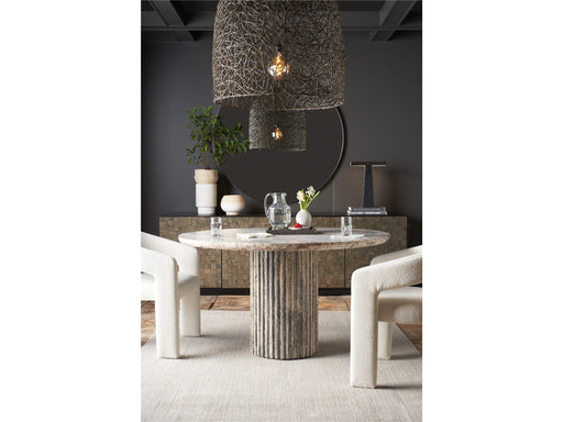 Universal FurnitureThe Meadow Dining Table presents a beautifully circular form, crowned with an exquisite White Travertine surface. The base is intricately textured,...