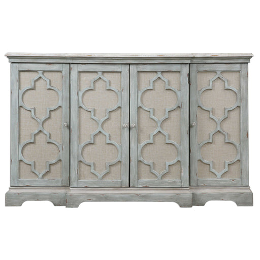 UttermostBreakfront Console In Weathered Sea Gray With Ivory Accents. Open-carved Doors Are Backed In Light Tan Linen, Enclosing Three Adjustable Shelves.Pr...