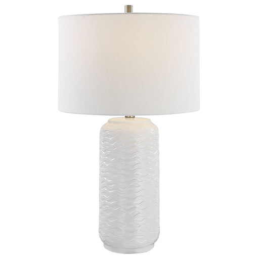 Salt & LightAll white ceramic table lamp features a wavy texture, accented with brushed nickel. The round hardback shade is a white linen fabric.Product Featur...