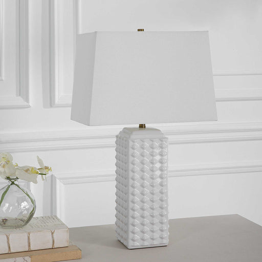 Salt & LightThis fun, 25" square body ceramic table lamp is designed with organic diamond shaped knobs and finished in a gloss white. The rectangular hardback ...