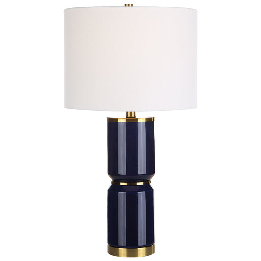 Salt & LightThis beautiful royal blue ceramic table lamp, accented with antique gold, sits atop a metal base. A thin metal band softens the wide cylinder body....