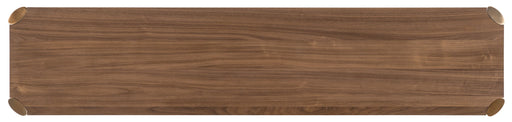 Redefine your media space with the Eleana Entertainment Console, designed with Light Caramel walnut veneers, plated metal legs, and solar-bronze ti...