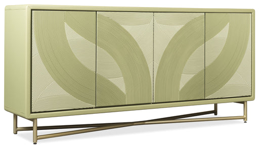 Four touch-latch doors with a carved leafy motif conceal adjustable storage behind this green credenza, grounded by a gold metal base.Product Featu...