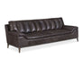 Sleek and modern yet plush and inviting, the Kador Leather Sofa’s seat and back has vertical channels, complemented by dramatic angular arms. The off-the-floor sofa is covered in the Debonair Graphite aniline top grain leather, and the legs are in a dark wood finish.