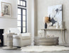 Futuristic and fashion-forward, the round Guilded Cocktail Table features a stepped design with contrasting silver leaf insets. It is crafted of Figured Primavera Veneers with a gray finish and silver leaf accents on the stepped insets for an artistic designer look.