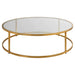 A Complement To Any Modern Space, The Radius Coffee Table Features An Iron Frame Finished In Lightly Antiqued Gold With A Clear Glass Top.
