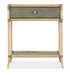 Inspired by tropical getaways, the two-tone Retreat Pole Rattan Bedside Table is a mixture of natural materials in a laid-back, versatile design. Crafted of Maple Veneers, Raffia and Rope, it features painted Raffia on the top and shelf in a Lagoon accent, while the frame and legs are in the finish. Featuring one self-closing drawer and one fixed shelf, the table has a glass top insert.