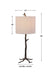 Hand cast with an organic base, this rustic lamp brings the look of nature indoors. Finished in a dark gunmetal and accented with gold highlights. The round hardback drum shade is a light beige linen fabric with natural slubbing.