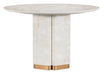 Bring modern artistry to your dining area with the Eleana Round Dining Table, featuring a faux onyx water-transfer finish paired with Sunlit Bronze metal accents. Its single pedestal design and 48-inch diameter make it a striking yet space-friendly centerpiece. Perfect for contemporary interiors, this table exudes an effortlessly chic vibe while delivering durability with its concrete, resin, and metal construction.