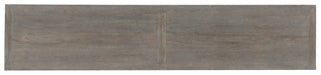 Tactile metallic floral medallion door fronts with cane inserts in a rich earth tone color palette make the Emmett Console a striking and stylish focal point. Crafted of Oak Veneers and Cane, the Emmett is media ready, featuring a ventilated back panel, power supply and accommodating up to an 80-inch TV. Four wood-framed pieced cane doors with touch latches and soft-close hinges have 2 adjustable shelves behind each pair of doors and 2 utility drawers behind the doors on the left side.