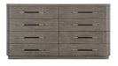 Softly sophisticated with a clean modern profile and luxe mixture of materials, the Modern Mood Dresser is a stunning statement piece. The case has rounded corners and a plinth base and offers 8 self-closing drawers. The top two drawers have drop-in felt liners, there’s a removable jewelry tray in the top right drawer and the bottom two drawers are cedar-lined. Crafted of Oak Veneers, the dresser is finished in the serene Diamond color and accented by metal pulls wrapped in leather.