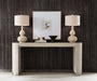 Architectural and timeless with a luxe mixture of materials, the striking Modern Mood Console Table has a narrow, rounded rectangle shape and metal-wrapped bands on the legs. Crafted of Quartered Oak Veneers in a light Diamond finish, the table has a rounded apron and legs, matched veneers on the top and is finished on all sides. At only 16 inches deep, the console can add style to even tight spaces.