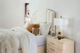 Modern, soft and inviting with the romantic flair of Parisian style, the Nouveau Chic Upholstered Bed is iconic and unique. Plush channeled fabric on the headboard and footboard is accented with silver-finished accent trim, while the frame is crafted of Oak Veneers finished in the serene with light wire-brushing. Includes the headboard, footboard and rails.
