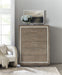 In a crisp two-tone finish combining a gray washed oak with a contrasting textured light gray color, the Serenity Five-Drawer Chest brings the organic textures of cottage waterfront living to your space. Crafted of Oak Veneers and resin, the drawers have soft-close drawer guides, the top drawer has a removable black felt liner and the bottom drawer is cedar-lined.