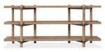 Inspired by the casual wine country lifestyle and the craftsman architecture of the Napa Valley, the Vineyard Row Console is crafted of Pecky Hickory Veneers with rustic hammered metal bracket accents and finished in the light-and-airy Sonoma. Featuring two fixed shelves, it can be used from either side and accommodates up to an 80-inch TV.
