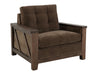 Wooden Frame & Base, Armchair. Step into comfort and make this armchair the focal point of your living room. The Walnut armchair features a sturdy wooden frame with a rich brown finish and wide, flat armrests. Both the seat and backrest are upholstered with durable and textured fabric. The backrest showcases a tufted design adorned with buttons. This piece features a solid wood frame and legs, adding an elegant touch. Diagonal wooden supports on the sides enhance its modern rustic charm, blending the warmth of wood with the sleekness of brown upholstery.