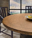 Tactile and rustic and evoking the artistry of true craftsmanship, the 60-inch round Big Sky Dining Table has an urn-shaped base finished in the Charred Timber color. The contrasting top is in Vintage Natural, a warm, organic finish over Hickory Veneers and a solid-wood edged top. Table accommodates ups to 6 coordinating dining chairs.