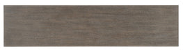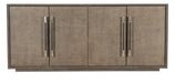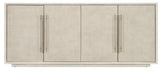 Sleek and stunning with a timeless sophistication and soft modern aesthetic, the Modern Mood Entertainment Console combines Quartered Oak Veneers with raffia-wrapped doors, warm pewter brushed metal bar pulls and leather accents. The Diamond Finish has crystal-like alabaster and pewter hues, offering a serene style. Features include four doors with soft-close hinges and magnetic catches, two adjustable wood shelves behind each pair of doors, ventilated back panels and wire management holes in the back panel and a three-plug electrical outlet behind the right-side doors.