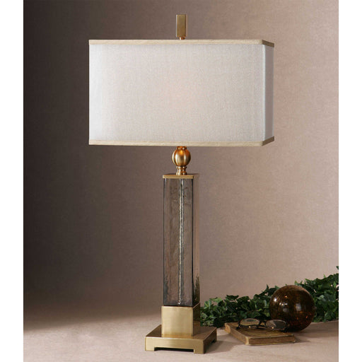 UttermostPaying Homage To Mid-century Style, This Table Lamp Features A Chrome Plated Glass Base Displayed On A Chunky Antique Brass Plated Foot And Finial....