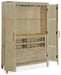 Escape the stress and extend hospitality to others with the resort-inspired Surfrider Bar Cabinet, featuring two bi-fold rattan doors, four drawers with self-closing drawer guides, two pull-out work surfaces, four pull-out wine shelves and eight stemware racks. Crafted of Pecan Veneers, Rattan and glass, the bar cabinet is finished in features the light natural Driftwood finish with distressing including sandblasting and bleaching. Lights are activated by a three-intensity touch switch.